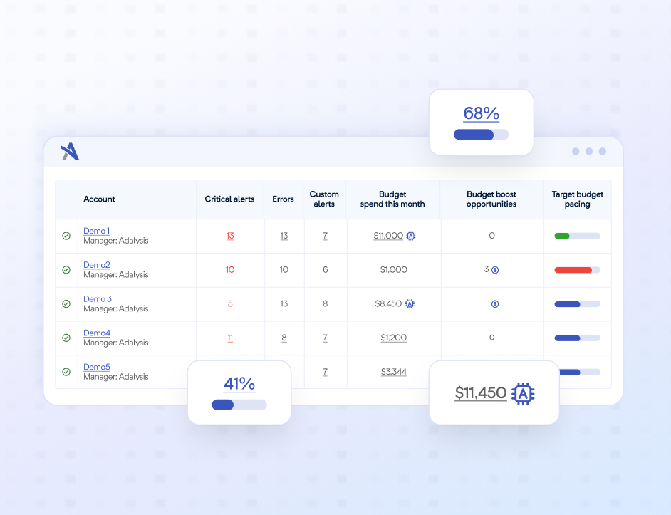 Adalysis is here to help. Our thoughtful automation helps your team ditch the spreadsheets for good. After all, faster insights mean more time for value-driving work. Set permissions at account or account-group level to control what each team member can see (and edit). Our plans also include onboarding, regular training, and technical support.