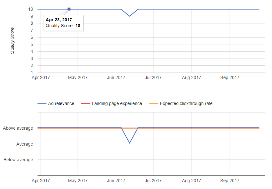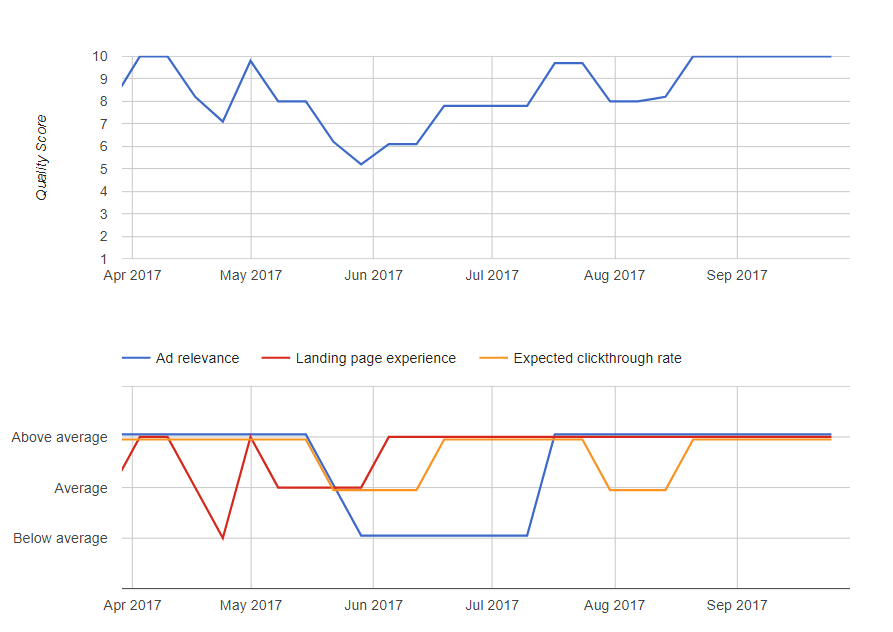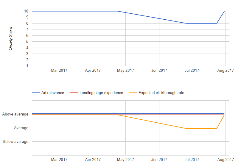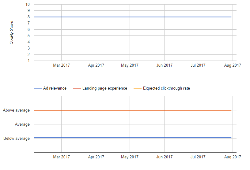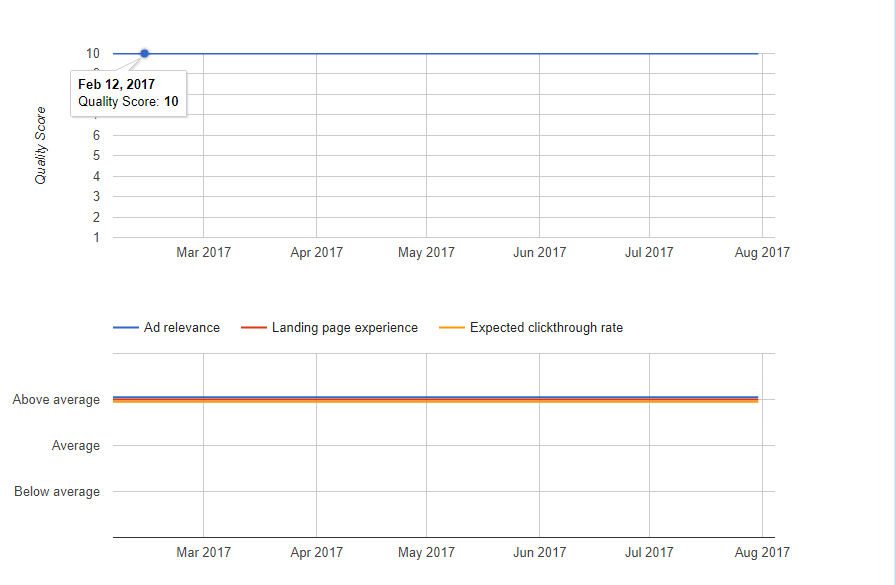 In some cases, this is always a 8-10 regardless of what the company does. It’s common to see this with branded ads. The company can constantly test and change ads and see their metrics improve; but the quality score remains the same. When it’s high, that is a good thing.