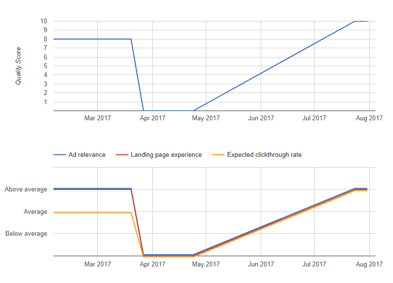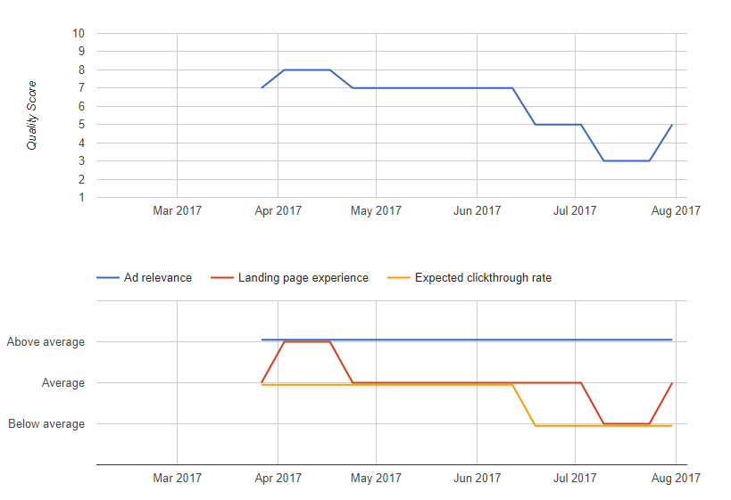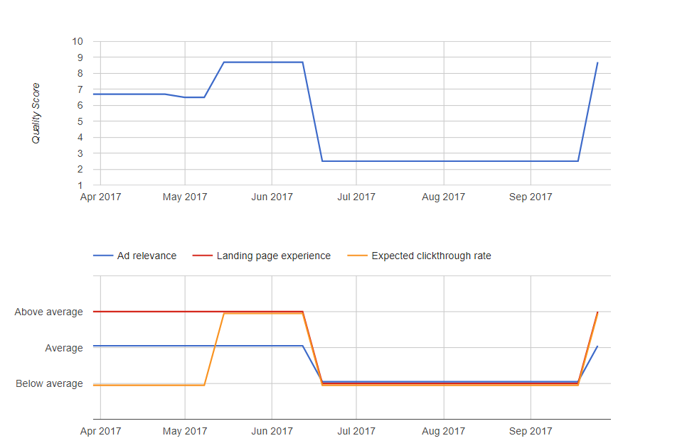 This is a good example of someone paying attention.  The quality score was steady, then dropped fast. The person realized the drop, made changes, and the quality scores went back up right way. When you are paying attention to your quality score trends, it’s not that hard to recover.