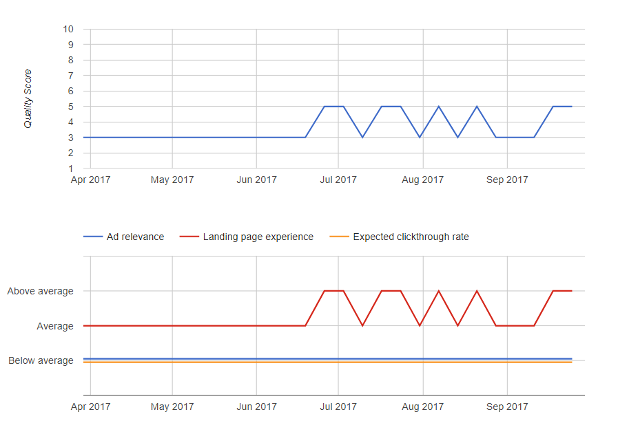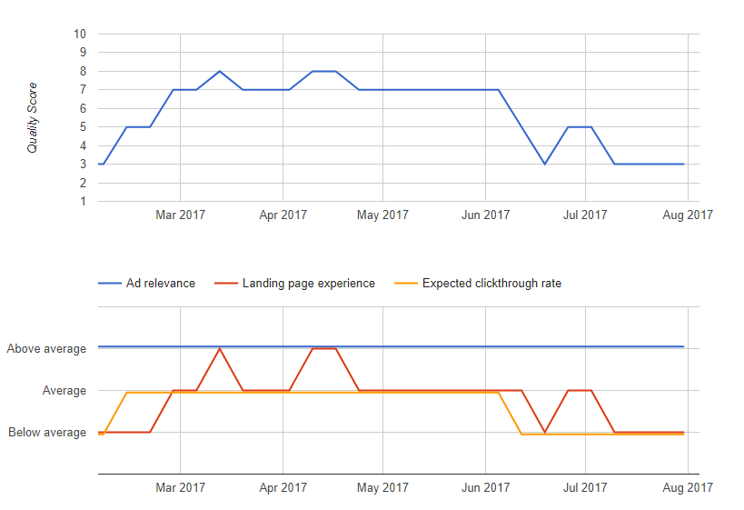 The issue though is when this is a 1-3. It’s common to see the flatline occur on very low quality scores as well. This is usually an indication that no one is doing anything in the account to try and improve it. Ads aren’t being tested, landing pages aren’t being improved, and that’s a problem.