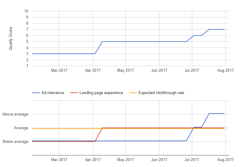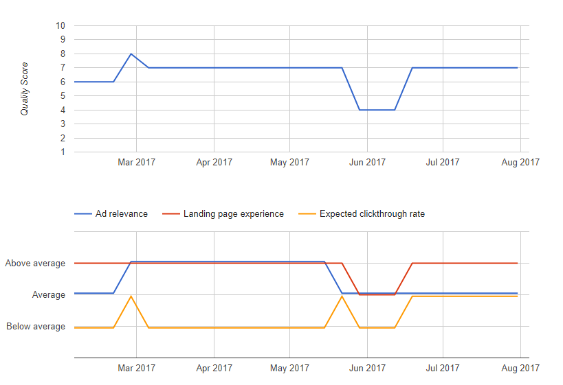 This is a great pattern to see. Someone is paying attention to quality scores. They are testing ads, making landing page changes. Over the course of 6 months, they took the quality score of one of their best keywords from 3 to 7.
