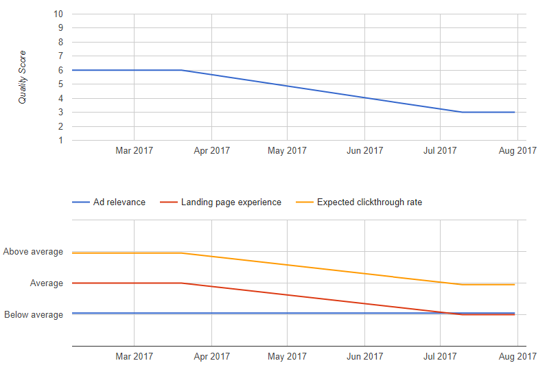 Outside of a flatline at a low Quality Score, this is one of the worst charts that exist. Every month you just get worse and no one is paying attention. This is why having alerts for Quality Score drops for your top keywords is so important.