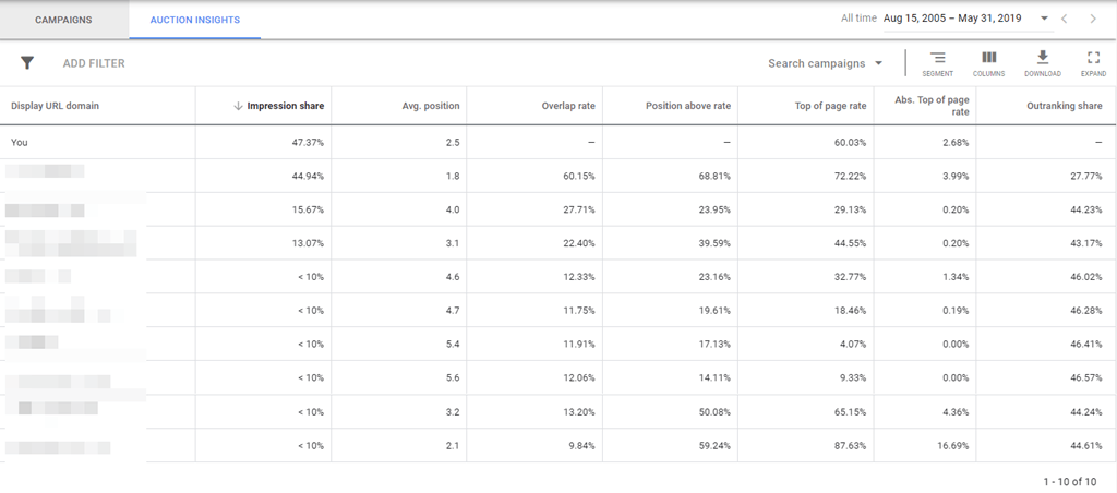 Challenging to see across campaigns: Different campaigns often advertise different products, services, locations, and so forth. It’s difficult in the interface to quickly see competitor information for many campaigns at once. This means that you either have to navigate through many campaigns waiting for the data to load or just look at the account level information, which can be misleading as you might have a strong competitor for one campaign and a different strong competitor for another campaign.