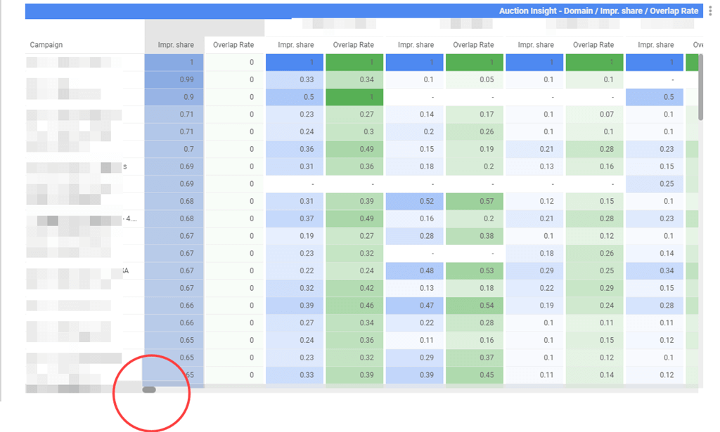 In Google Data Studio, you can build a report that shows you all your campaigns at once, along with some competitor data. Also, the Data Studio report generally shows many more competitors. For example, in this image, the small circle represents a side-scrolling window. For this company, they can see data on over 1000 competitors if they scroll left to right across all their competitor’s data.