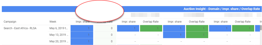 The one oddity about the template is that the header column for your data will be blank. As an example, in this report for the header row, we pixilated our competitor names. The very first column is empty (your data might not be the very first column) as that’s where our data is and for some reason in the Google Ads UI, you see ‘You’ in that column. In Data Studio, it’s just a blank header row. If you download the data, that column will be empty in the download as well, so you’ll want to fill in that column with your name before you create any charts, graphs, or pivot tables.