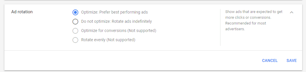 • If you are adding many new ads, use rotate until the ads get enough data to where you can turn on optimize and let Google figure it out for you