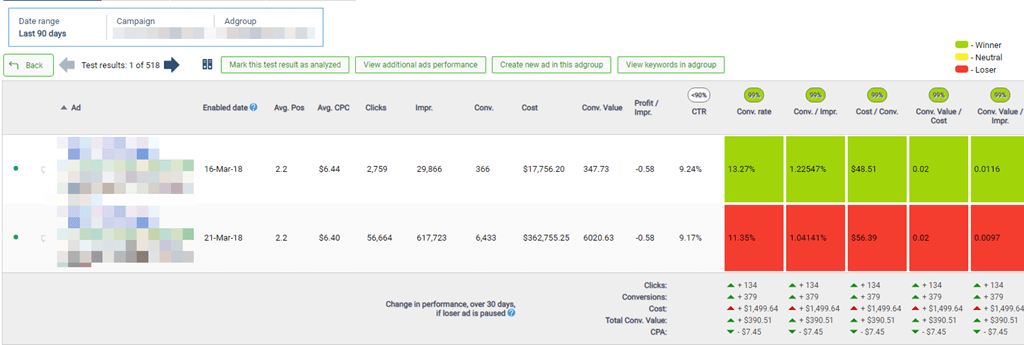 The first thing to note in our charts, we show the ‘enabled date’ of the ad so you can see when an ad was first enabled. However, the stats are only based upon the timeframe comparison. So, in our first example while the one ad was enabled 5 days before the second ad; the data shown is the last 90 as both ads were active in that timeframe. We do not compare data for date ranges when some ads weren’t actively competing against each other.
