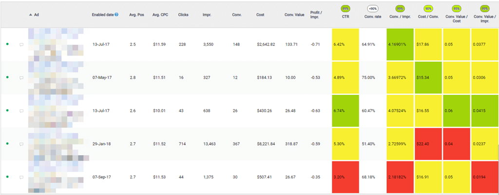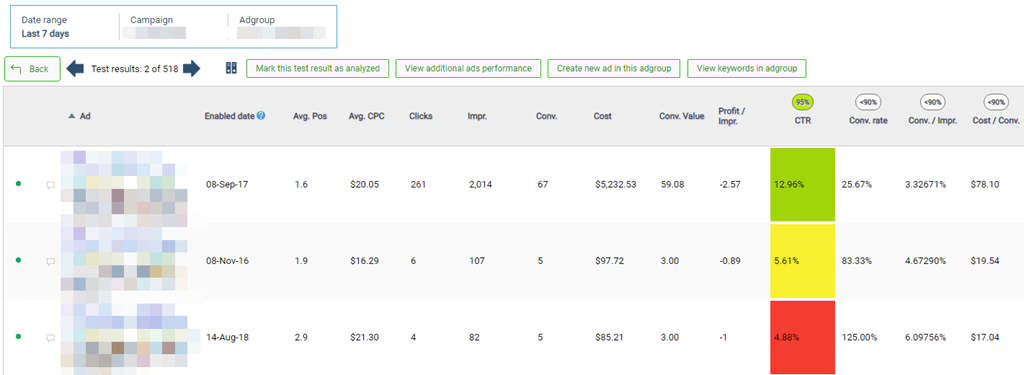 Yet this new ad has only been displayed 82 times in the last 7 days while just one ad has dominated the impressions at more than 2,000. In addition, when our new ad shows, its average position is 2.9 compared to our highest impression ad at a 1.6; therefore, Google isn’t even treating these ads evenly to figure out the best one to show.