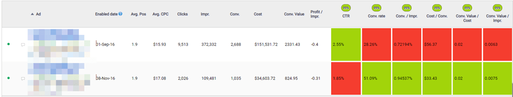 In this case, the opposite is true; Google has barely displayed the new ad (which is in the same campaign as our previous example). While it does have a lower CTR, it has a higher conversion rate and conversion per impression. With only 4 clicks; it’s impossible to tell if those trends will continue or not but when your first 4 clicks turn into 5 conversions; you probably want this ad to have a chance.