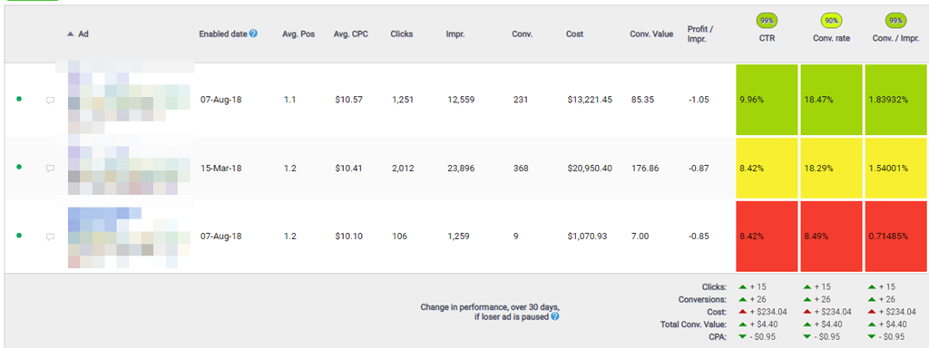 Usually, but not always, when one ad is a winner in every single metric – Google will show that ad the most often (although, one could argue that ad 2 is still shown too often with such a clear trend):