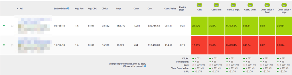 In our first example, the ad with the best CTR (which is not statistically significant), conv. rate, conversion per impression; and every single other metric was only served 29,866 times versus the ad that has the worse metrics was served 20 times more often with 617,723 impressions.
