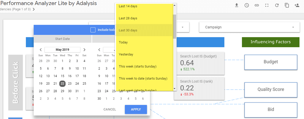When looking at individual campaigns or ad groups for large accounts, using last 7 to last 30 is also a good idea since you’re no longer looking at an entire account but a specific campaign or sets of campaigns.