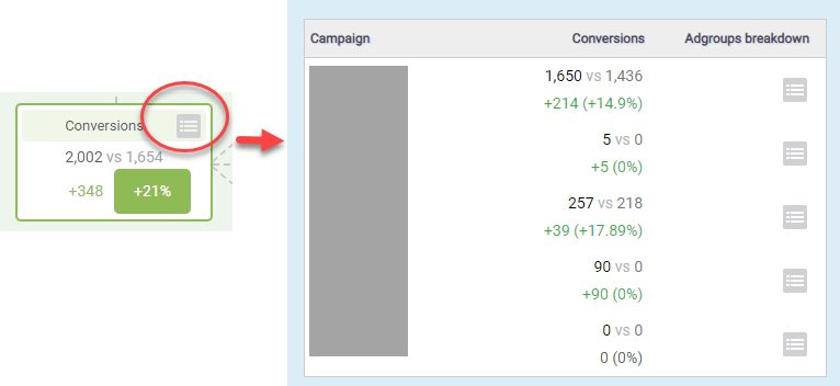 With the performance analyzer, there are two ways you can also look at your data to see what is causing issues. The first is to click on the bullet list icon, and you’ll see a list of your campaign comparisons. Then you can even click into the problem areas to see an ad group breakdown and find the issues without looking at like campaign types. The biggest problem with this is that if one campaign went down less than another went up, the overall data might look good, and you ignore the fact there is an issue.