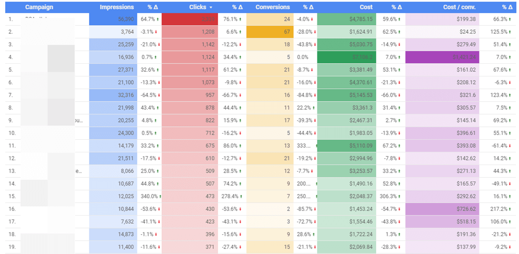 In the Data Studio version, on the 2nd page, you can see a heatmap of data changes by campaign to isolate where the problem areas are occurring and then do a detailed performance analyzer report for just those campaigns.