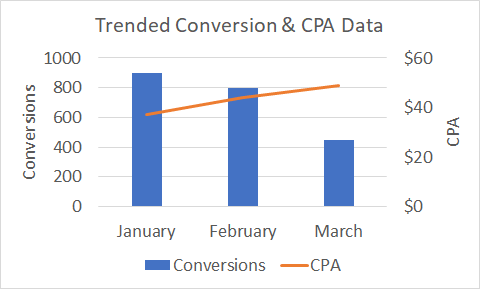 For example, if this is your data (conversions going down and CPA going up), then it looks like there is a massive issue at play. If you are a non-seasonal business, you should be digging into the root cause of this issue to put some fixes in place.