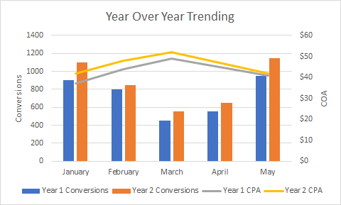 In year over year data, we’re comparing our data to the previous year. If we take the above chart where it appeared we were doing pretty poor and fill out the year over year trend; we see that year over year, we are getting more conversions than the previous year, although at a slightly higher CPA.