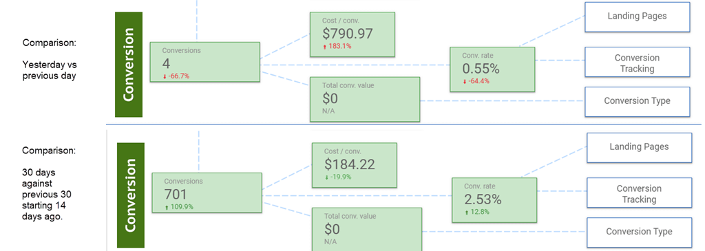 Since we know that there is a delay in conversion tracking and that it takes people a while to convert, to see how our efforts were doing, we select a custom timeframe of 30 days starting 14 days ago as that will help accommodate the conversion delays. Then we compare that to the previous 30 days.