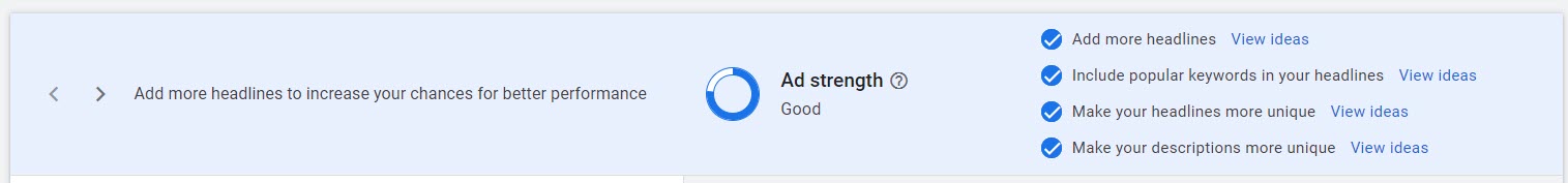 As you add or edit headlines, your ad strength changes dynamically. In addition, Google will show suggestions to improve your ad strength.