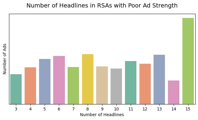Ad strength isn’t only about the number of headlines you have. Google also checks if your keywords are in the headlines and if you have diverse enough content in your headlines. To confirm that ad strength is not only dependent on the number of headlines but rather on the content as well, we examined RSAs that have Poor ad strength and found the majority of them have 15 headlines.