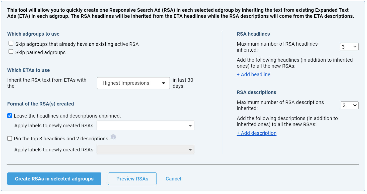You can then use the tool below to create one RSA in each ad group using the ETAs ad copy in that ad group.