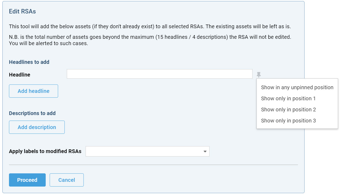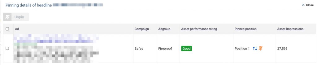 - When you want to highlight a promotion by pinning an asset across multiple RSAs. You will need to see how an asset is currently pinned and be able to bulk modify the pinning for that asset.