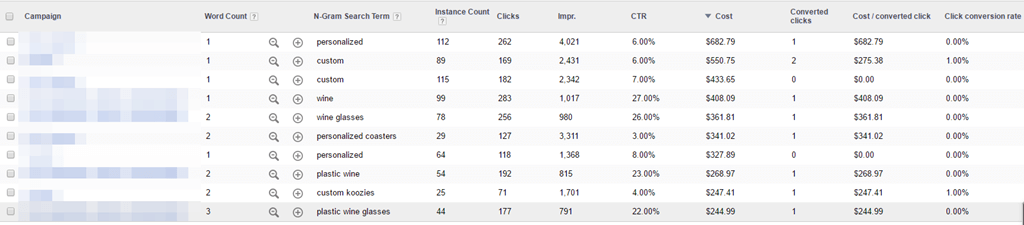 For instance, in this account, the word ‘napkins’ occurs in 1804 different queries. These search terms have a 4% conversion rate, so napkins is an important word for this advertiser.